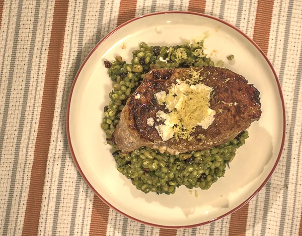 - Scoop barley onto plate & top with pork chop. garnish with lemon zest & crumbled feta