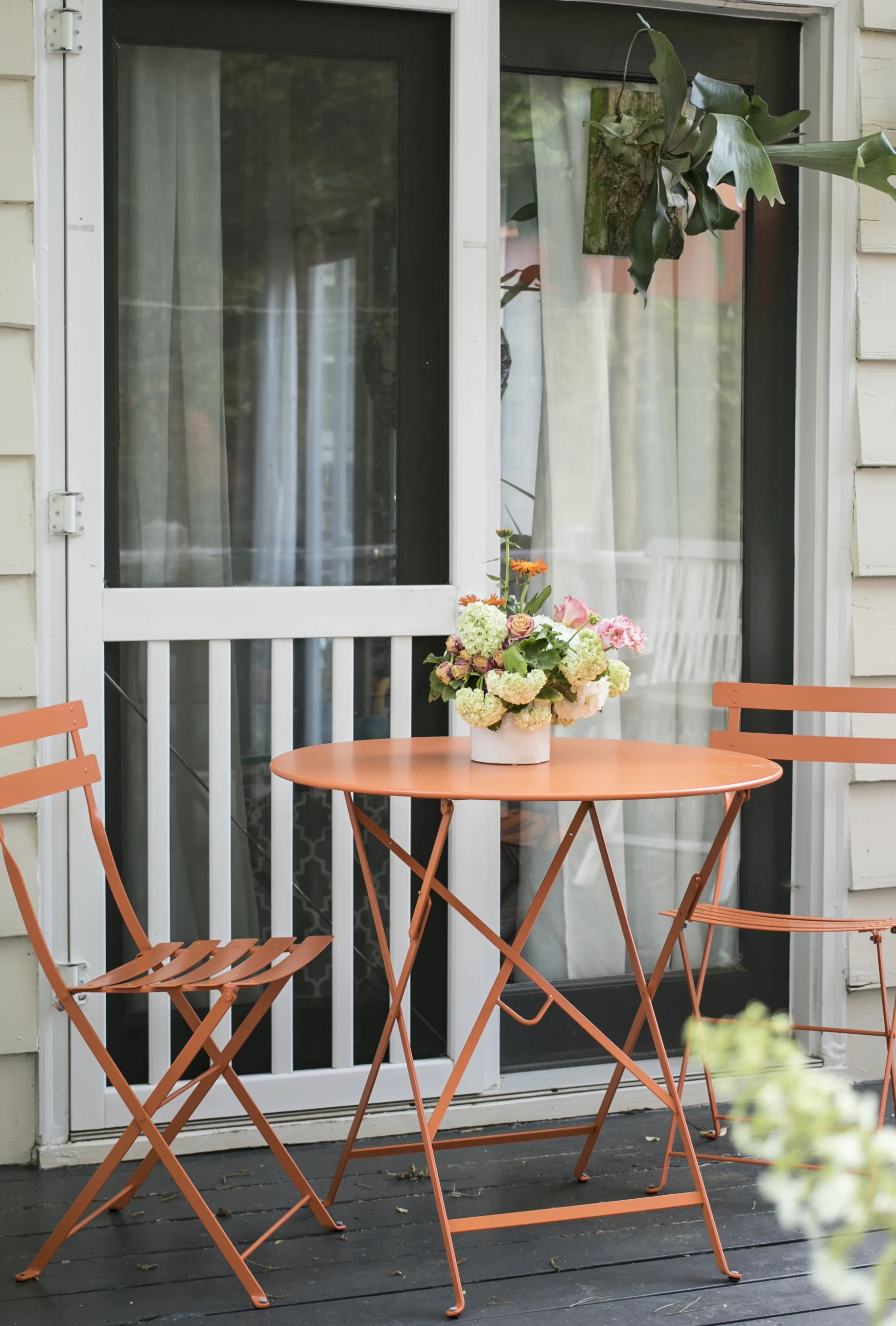 A few months ago the wonderful people at FermobUSA sent me this awesome orange bistro table. We have loved eating dinner at it and using it for parties. Here it is showing my Pollen arrangement and the orchid/antler combo. This table and the chairs come in all different colors, which you can find here. I could not recommend it more.